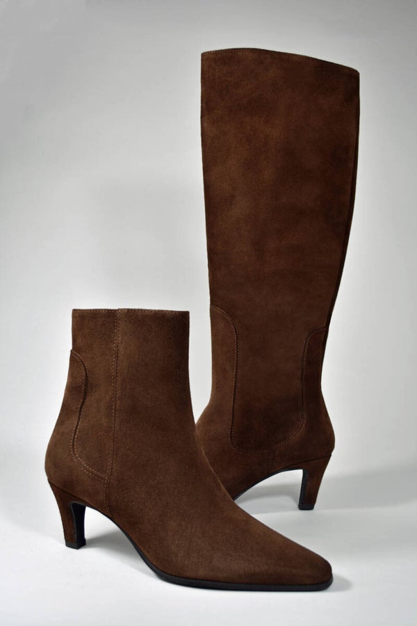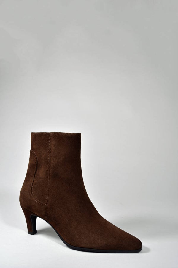 Enkellaarsje met 5 cm stevige en elegante hak. Uitgevoerd in zacht bruin suede. Valt op maat.