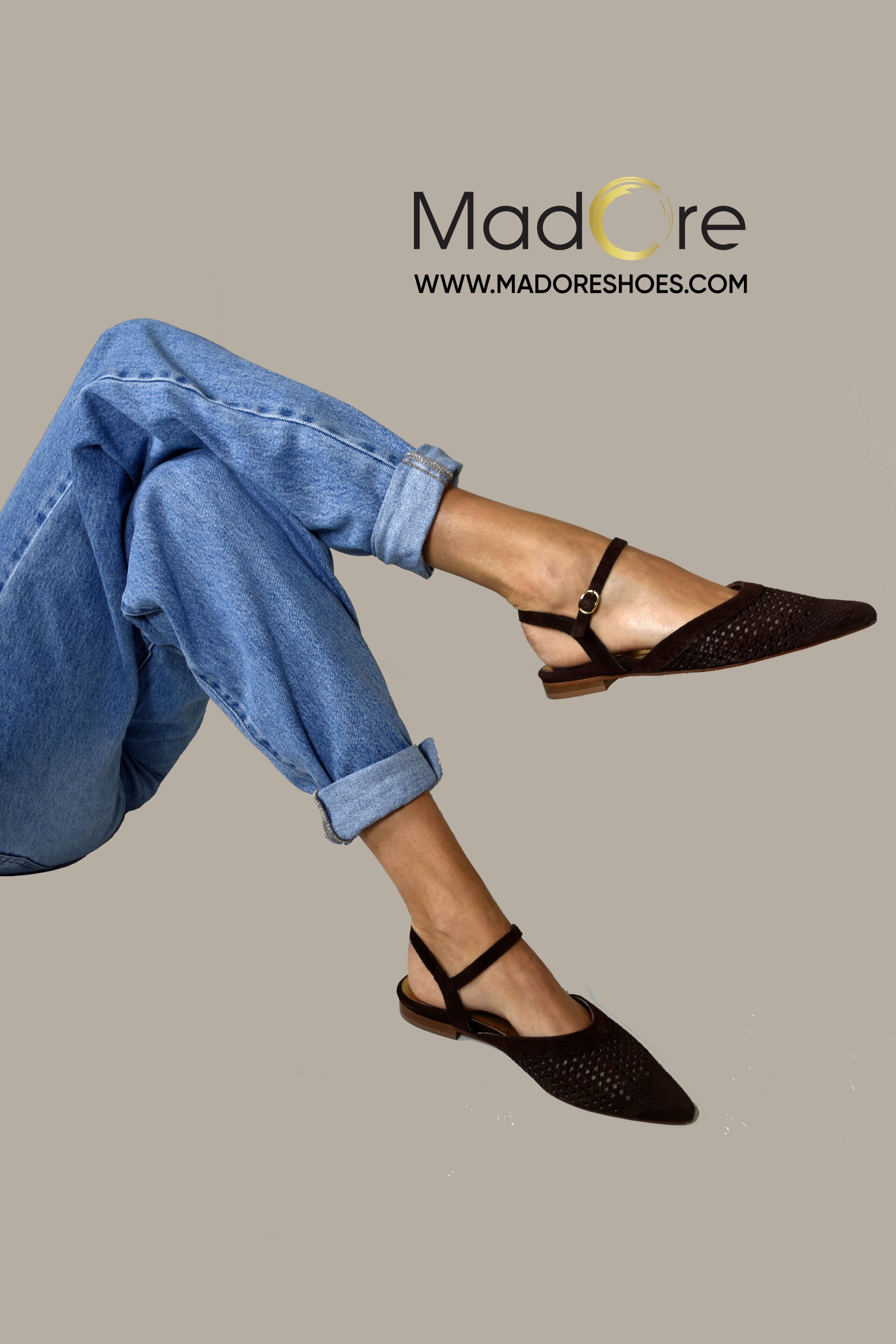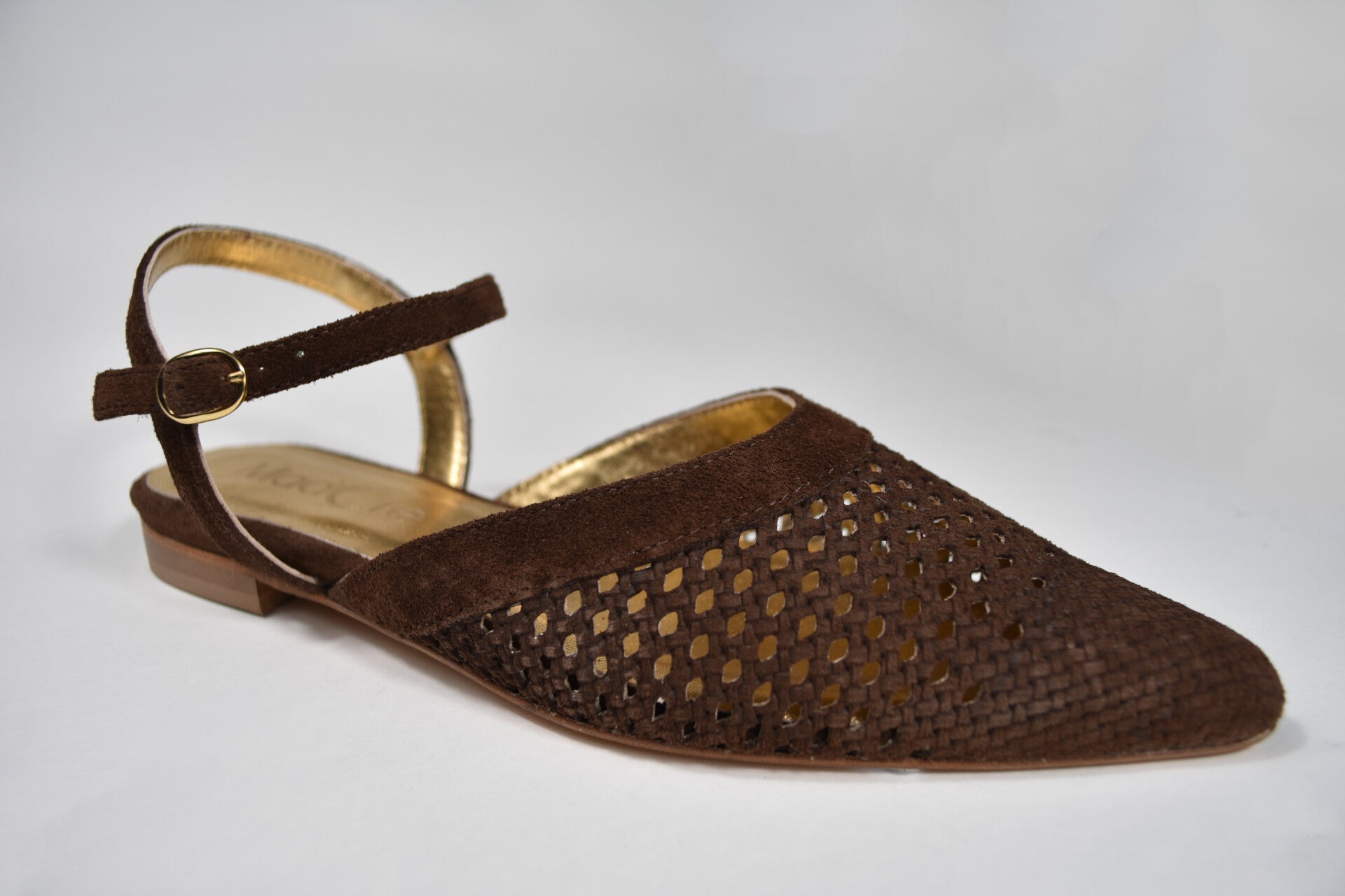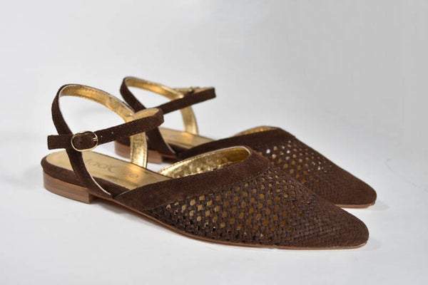 Onze nieuwe aanwinst een platte punt ballerina met vlechtprint op voorblad. In bruin mocca suede met goudkleurige leren voering en superzachte binnenzool van goudkleurig leer.