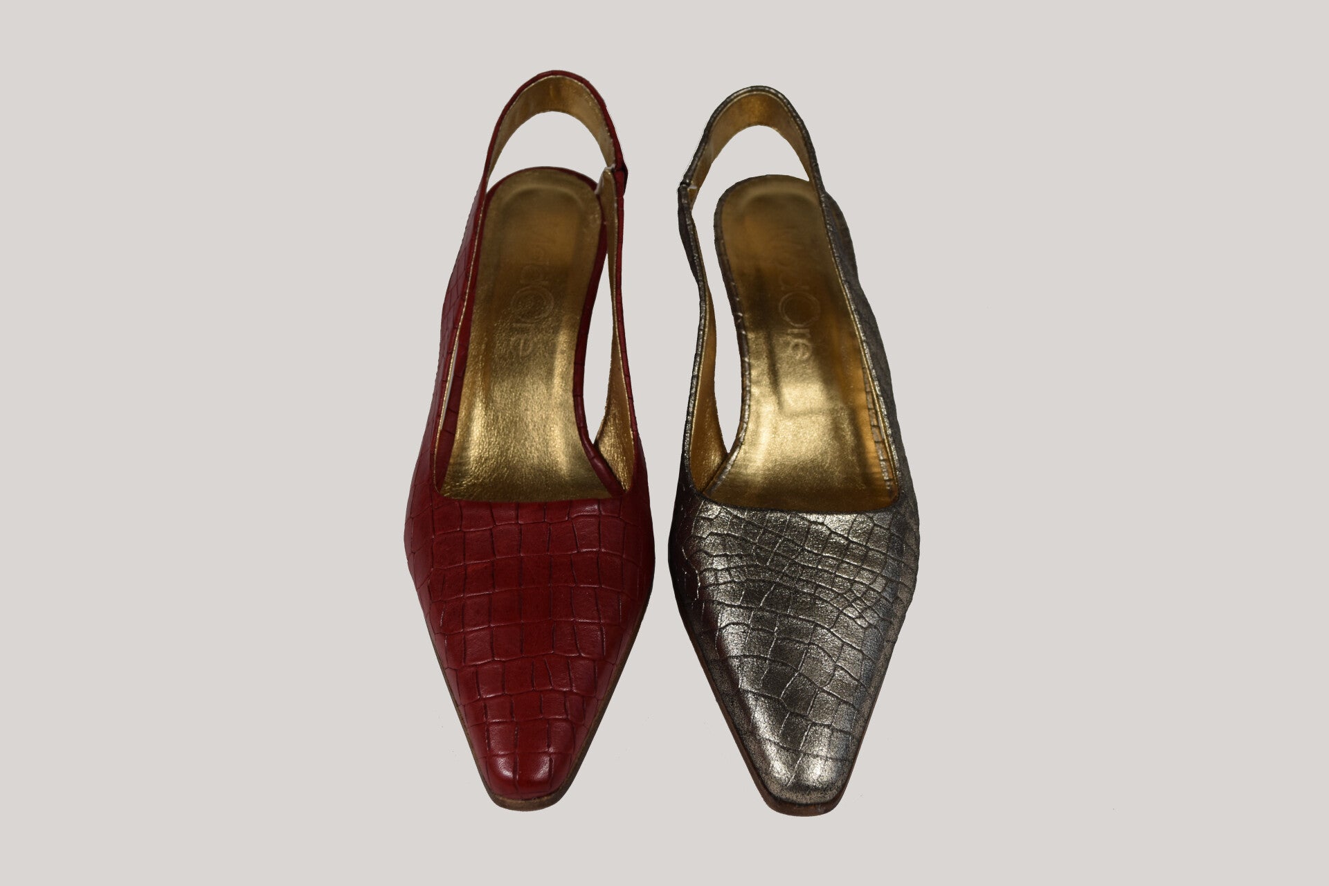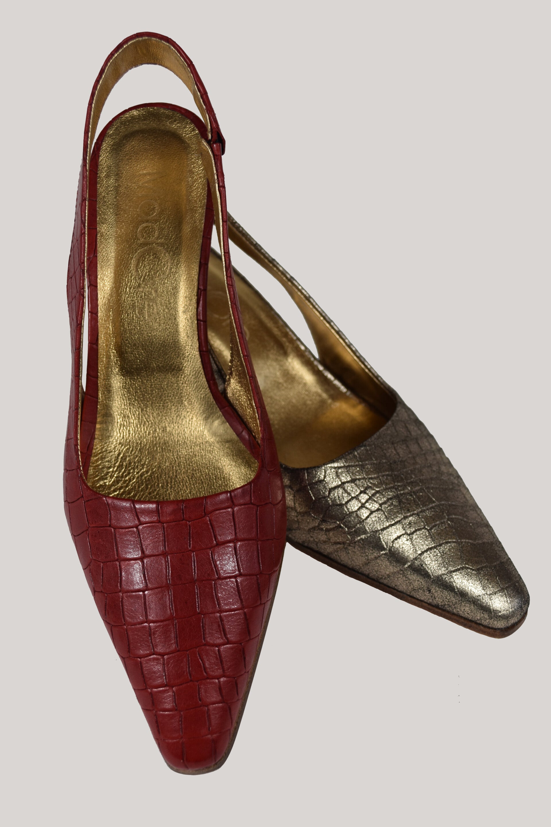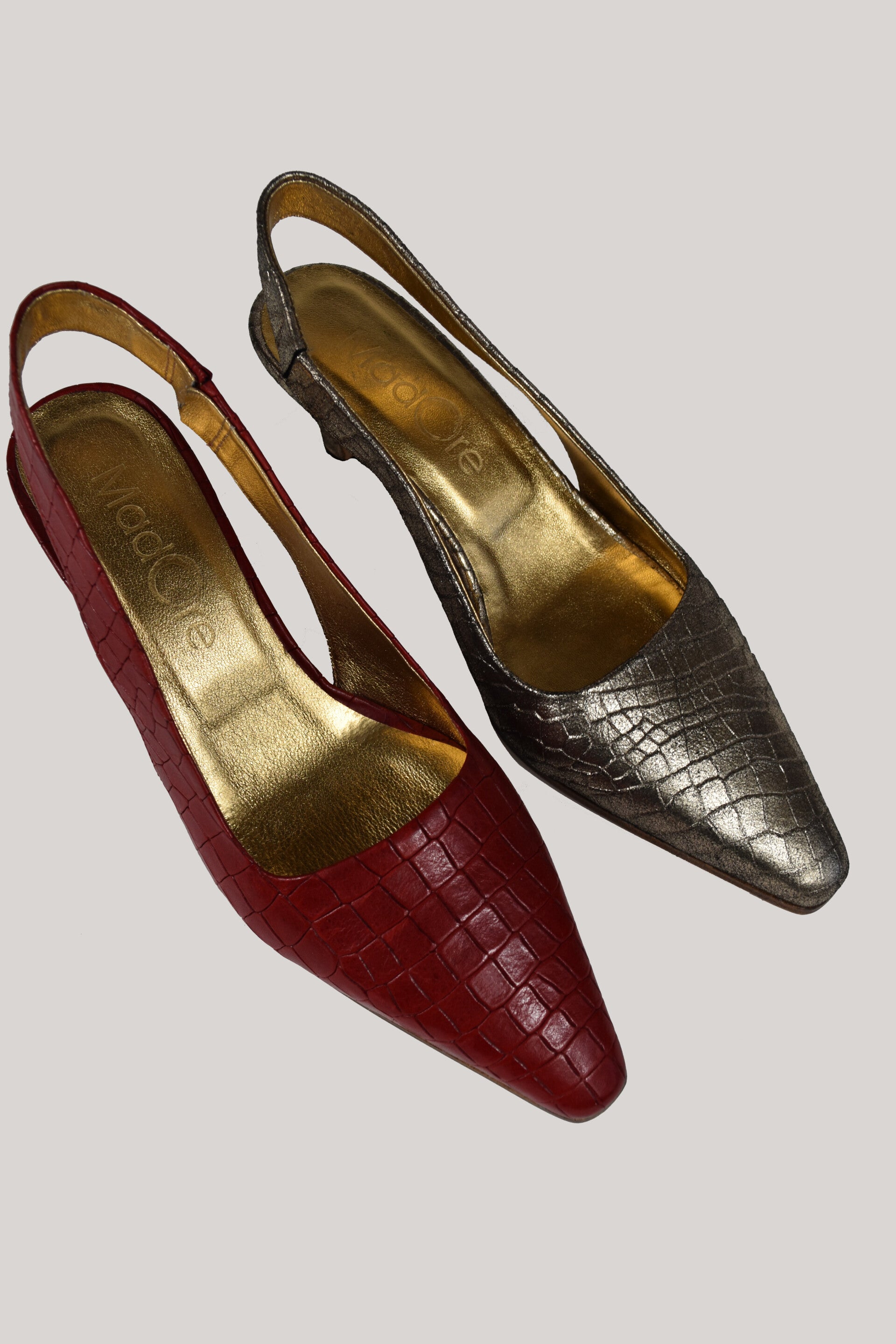 Stijl, comfort en kwaliteit in een paar. Deze slingbacks hebben een comfortabele hak en zijn gemaakt van mooi geprint croco leer. Met de gouden MadOre voering en leren zool.